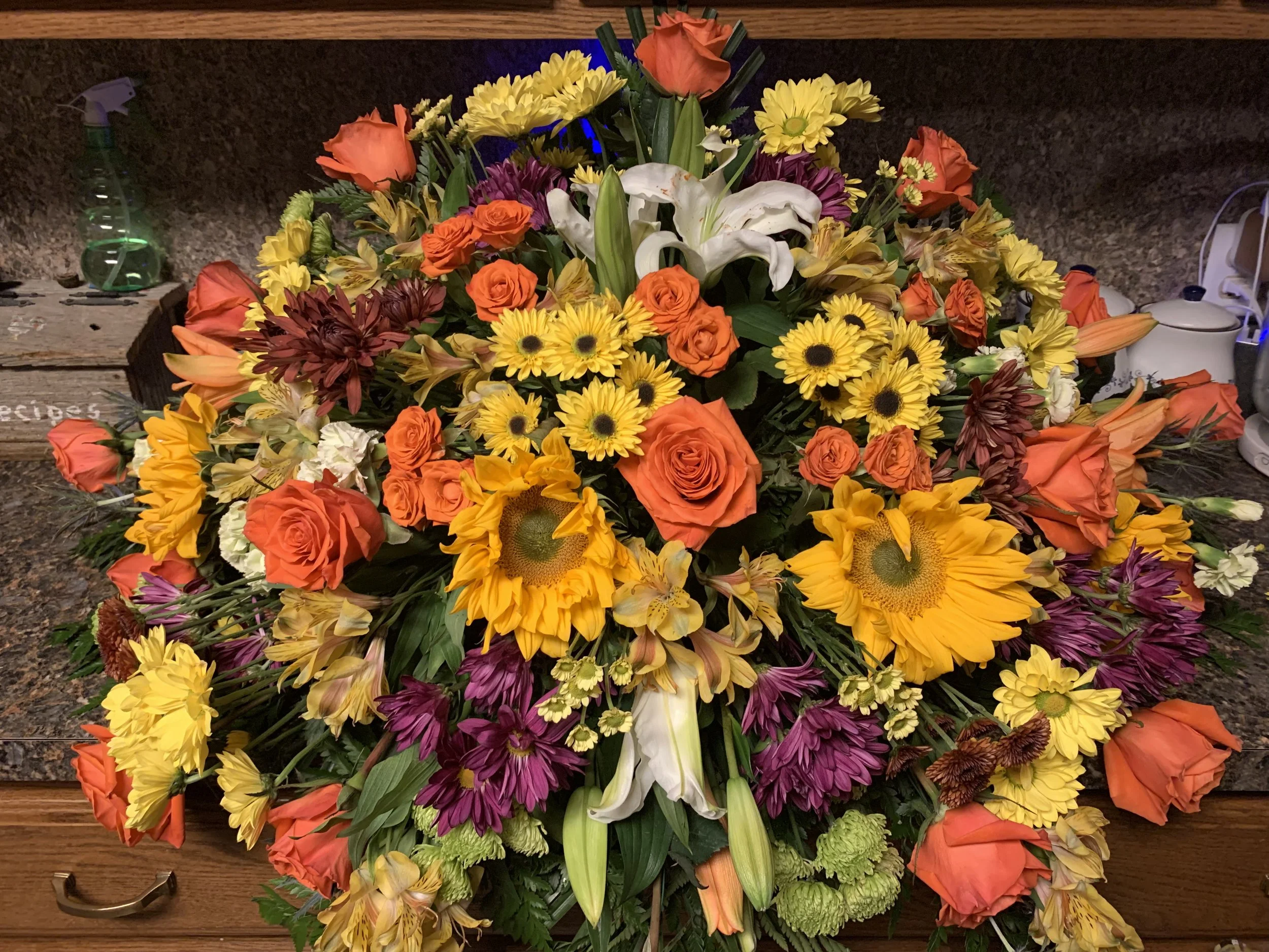 A large bouquet of mixed flowers including orange roses, yellow sunflowers, purple daisies, white lilies, and other colorful blooms on a kitchen countertop. View fullsize